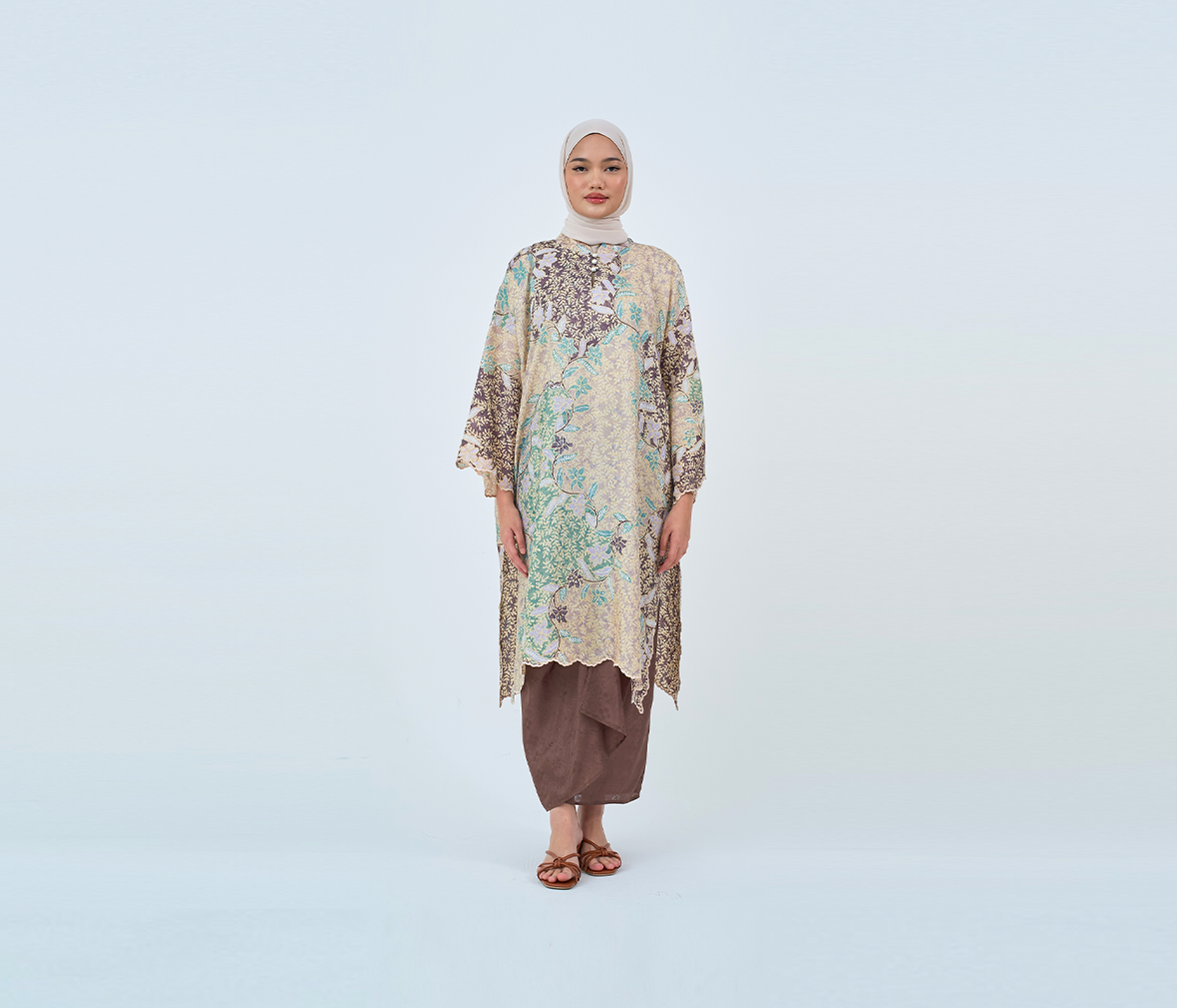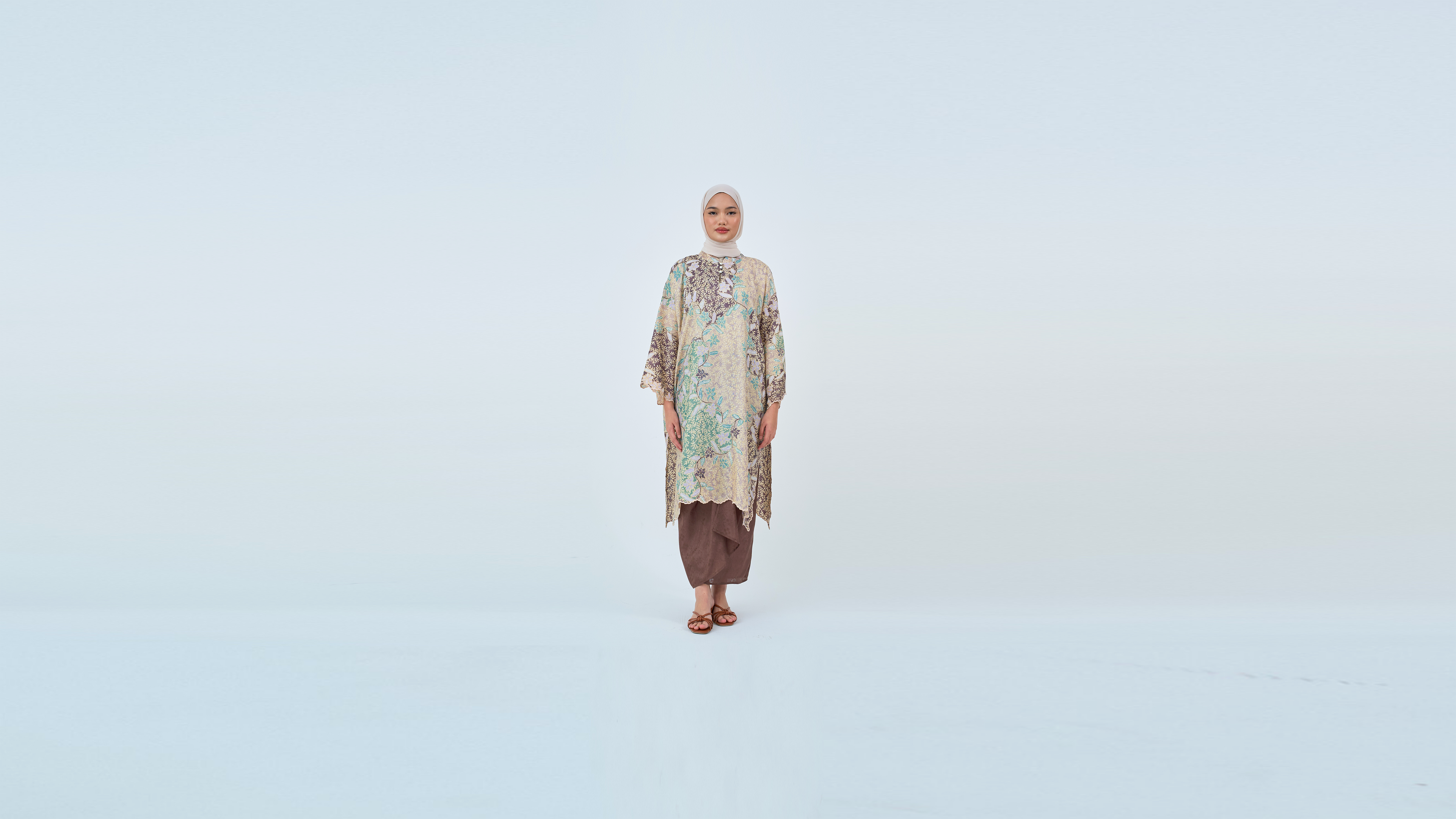DAHLEA from TheaKL - features a loose, oversized fit with traditional kebaya length, enhanced by side slits, drop shoulders, and delicate embroidery seams on the sleeves and front bodice for a lightweight, flowy finish.