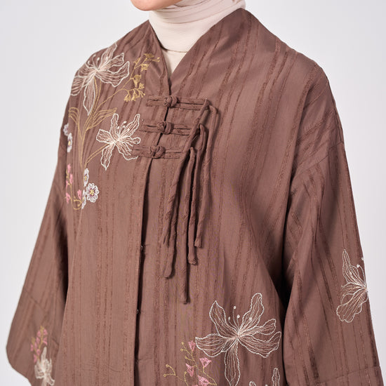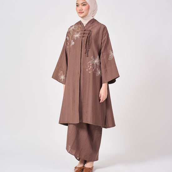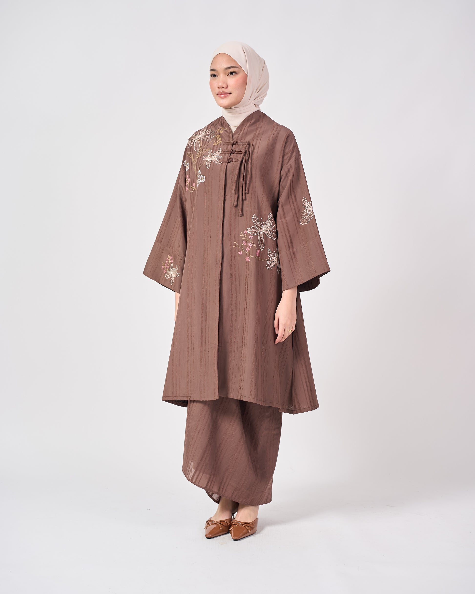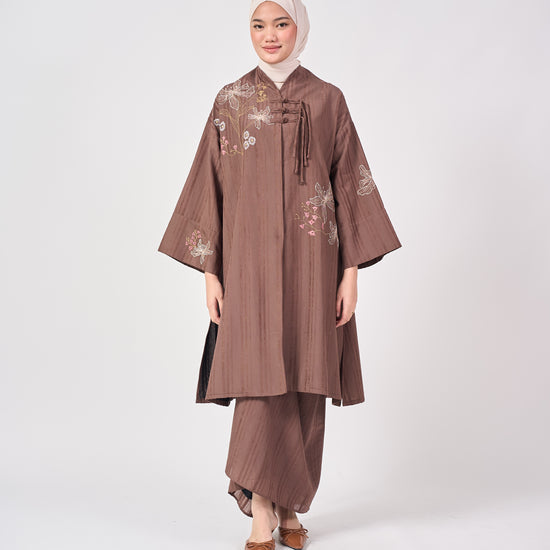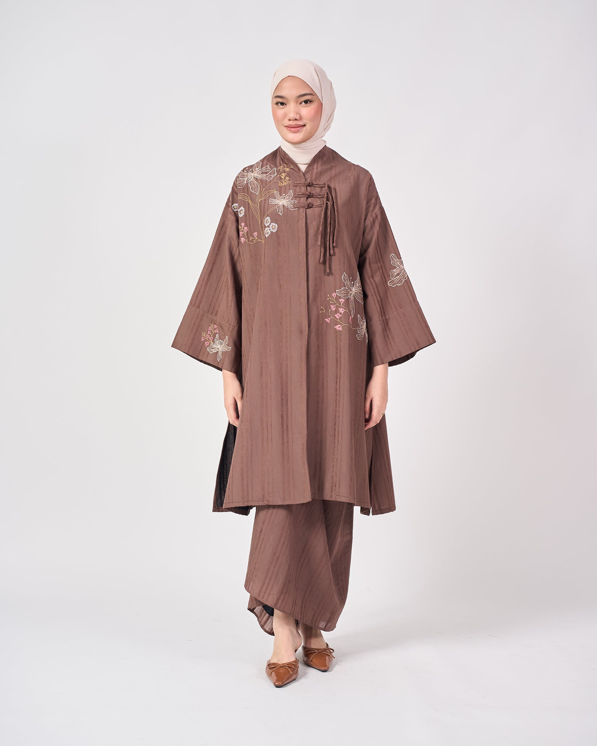 The Jasmin set inspired by the timeless elegance of the Cheongsam, reimagined with a modern, relaxed silhouette. Designed with signature Shanghai knot buttons and soft floral embroidery along with the mandarin collar, it blends classic charm with contemporary grace.