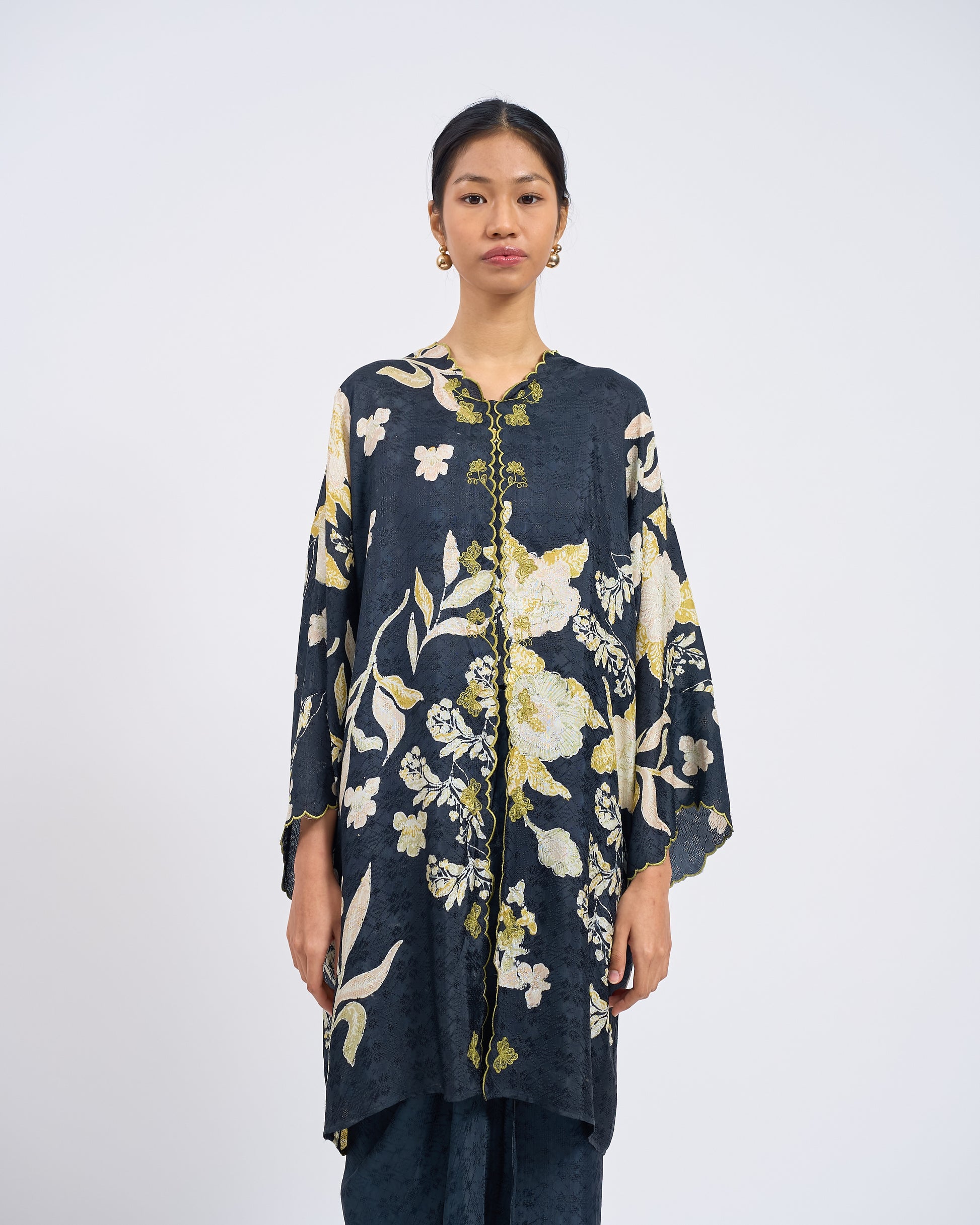 KHADEEJA is a modern kebaya labuh inspired by traditional kebarung silhouettes. Featuring drop shoulders, a straight cut and front snap fastening, it’s made for women who love structure with ease.