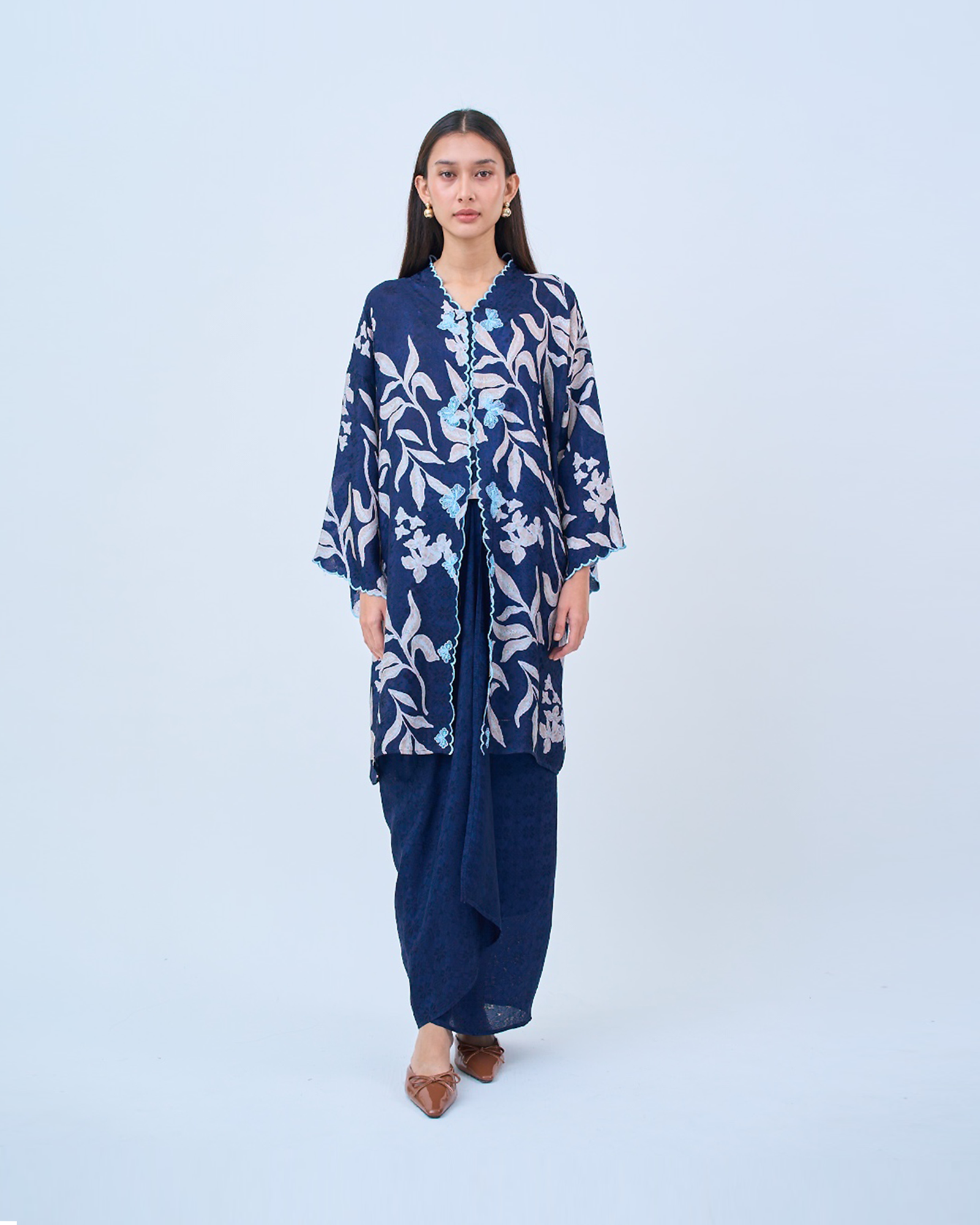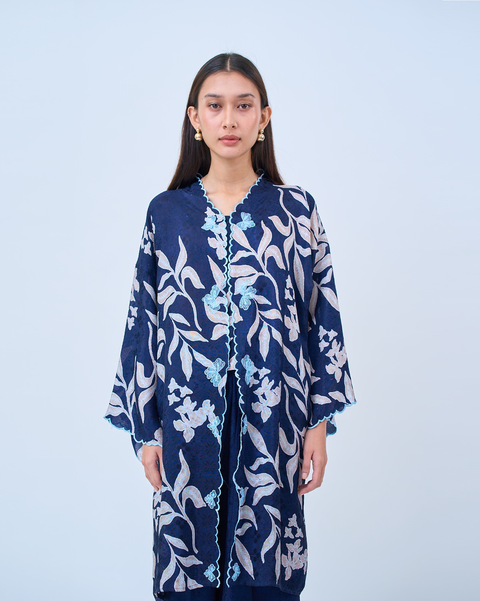KHADEEJA is a modern kebaya labuh inspired by traditional kebarung silhouettes. Featuring drop shoulders, a straight cut and front snap fastening, it’s made for women who love structure with ease.