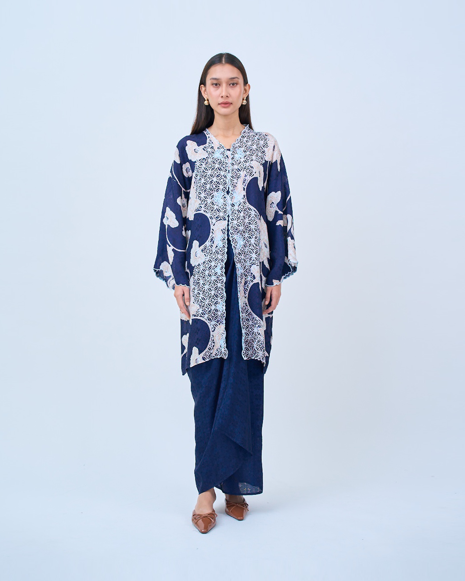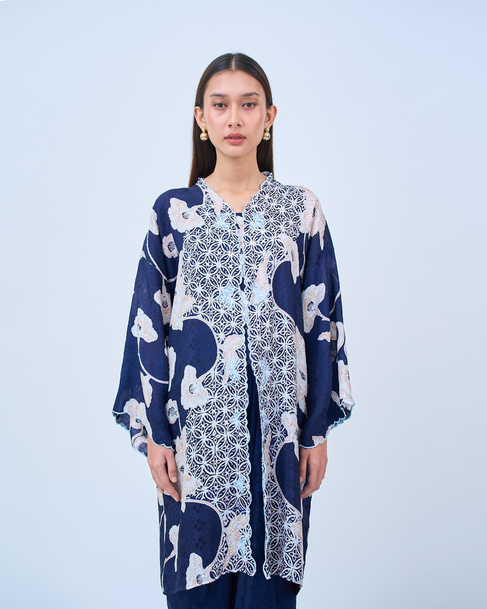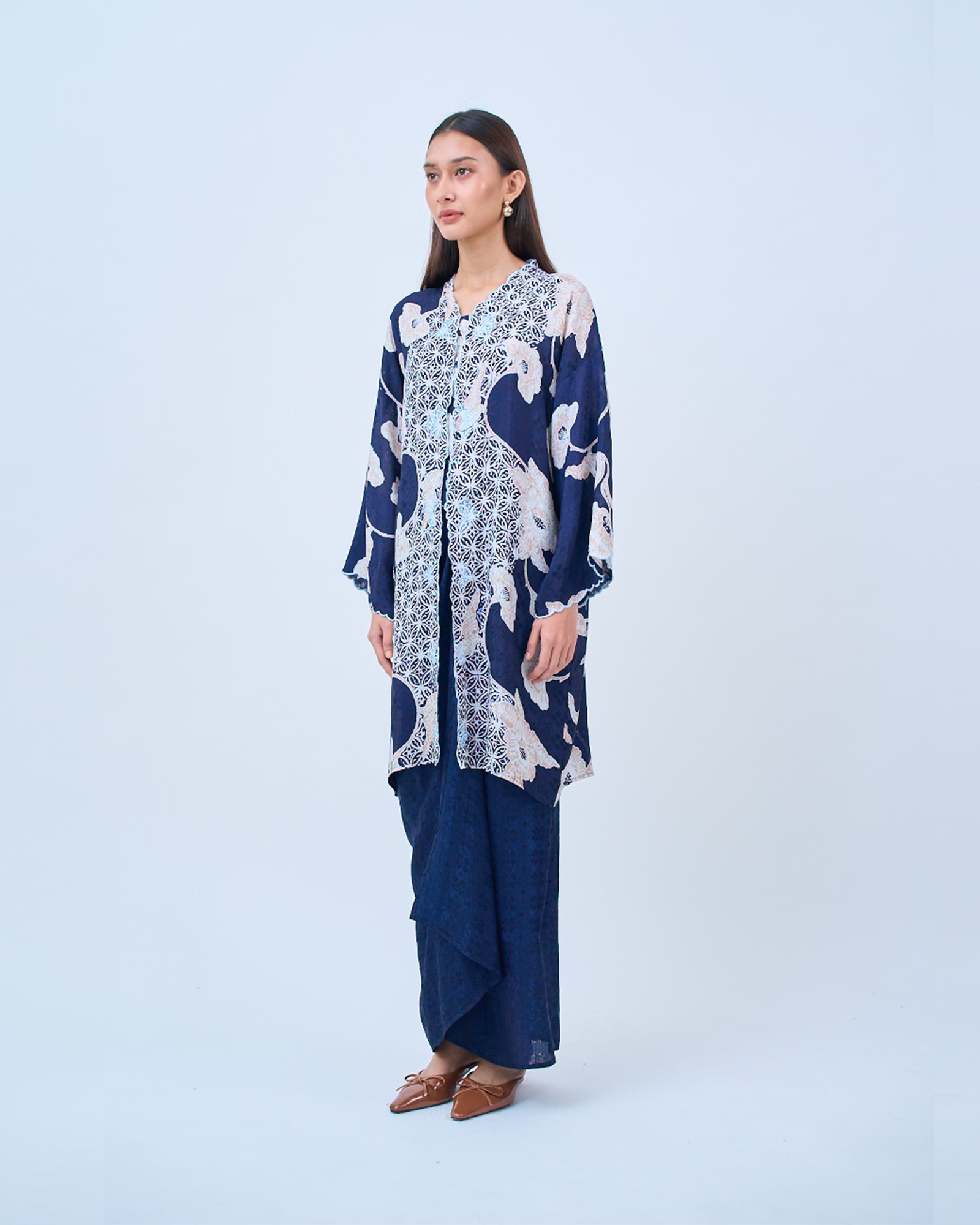 KHADEEJA is a modern kebaya labuh inspired by traditional kebarung silhouettes. Featuring drop shoulders, a straight cut and front snap fastening, it’s made for women who love structure with ease.