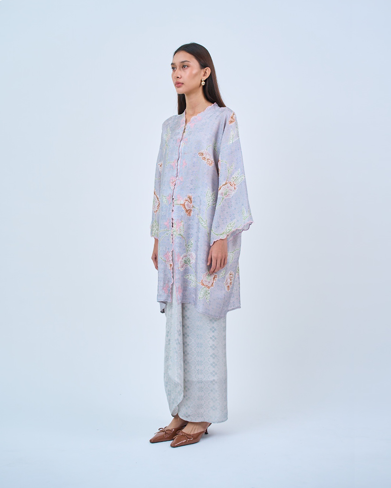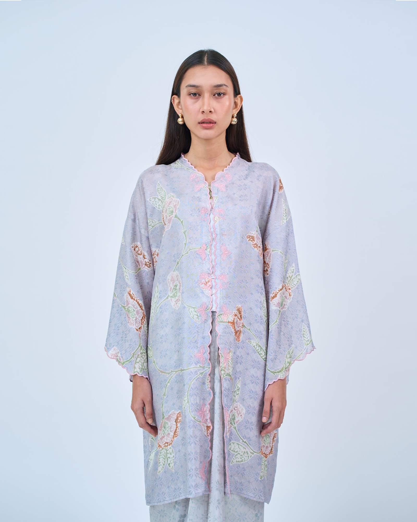 KHADEEJA is a modern kebaya labuh inspired by traditional kebarung silhouettes. Featuring drop shoulders, a straight cut and front snap fastening, it’s made for women who love structure with ease.