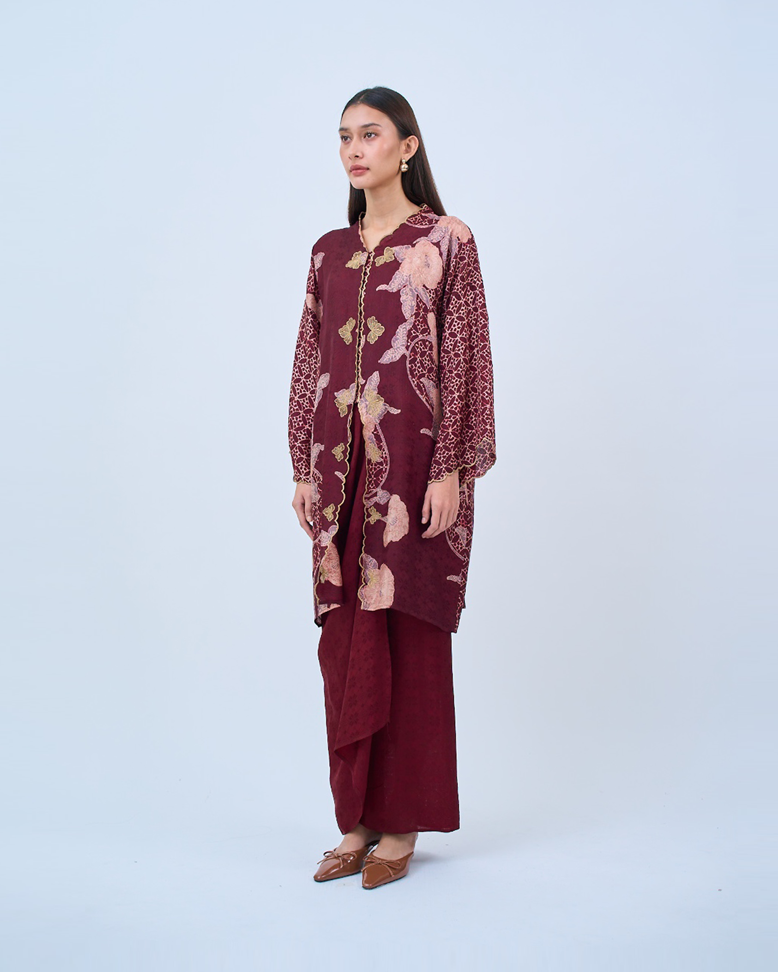 KHADEEJA is a modern kebaya labuh inspired by traditional kebarung silhouettes. Featuring drop shoulders, a straight cut and front snap fastening, it’s made for women who love structure with ease.