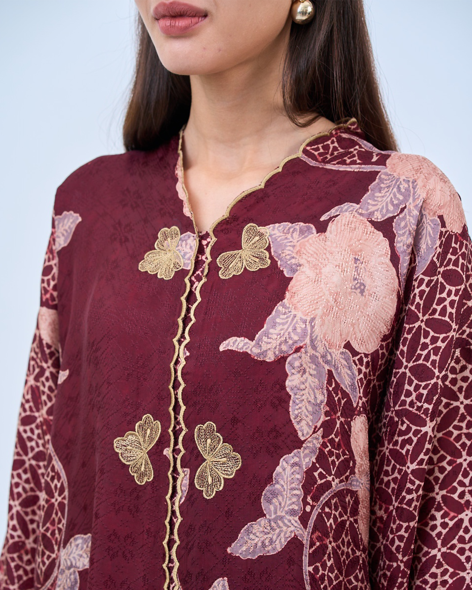 - The placement of motifs, colour tones, and sulam (embroidery) details will vary from one garment to another. Each set is uniquely crafted and no two pieces are totally identical, making your garment exclusive to you.