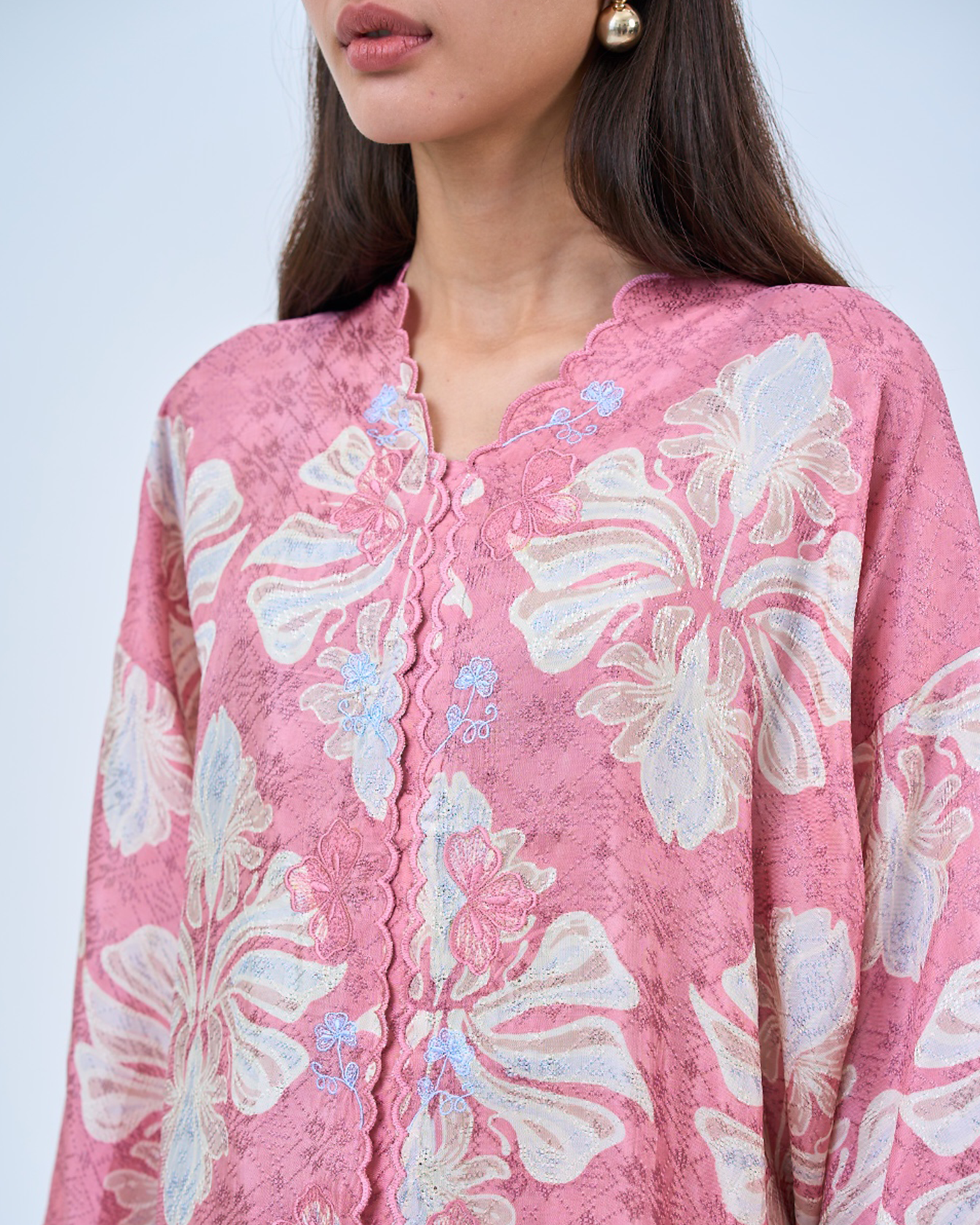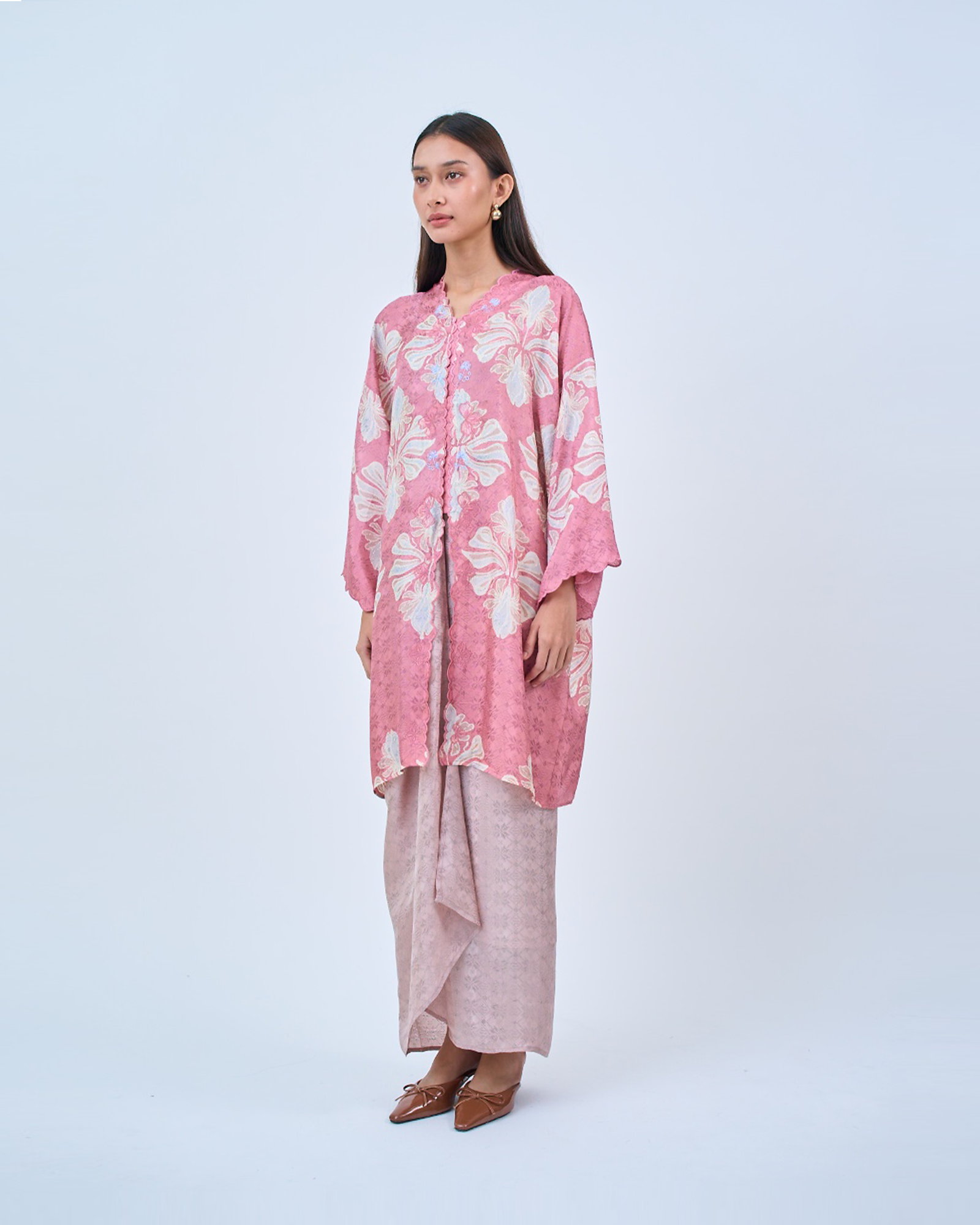 KHADEEJA is a modern kebaya labuh inspired by traditional kebarung silhouettes. Featuring drop shoulders, a straight cut and front snap fastening, it’s made for women who love structure with ease.
