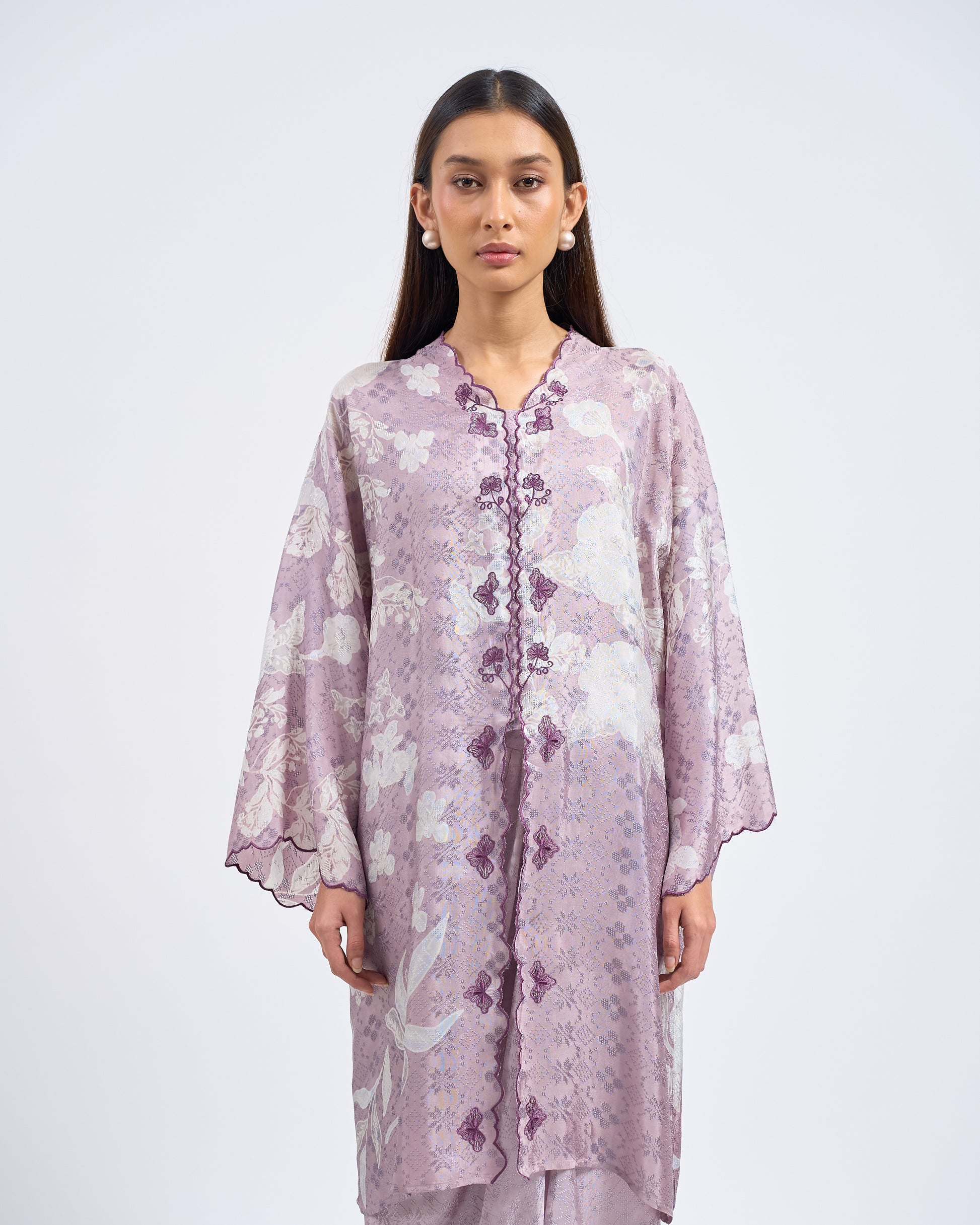 KHADEEJA is a modern kebaya labuh inspired by traditional kebarung silhouettes. Featuring drop shoulders, a straight cut and front snap fastening, it’s made for women who love structure with ease.