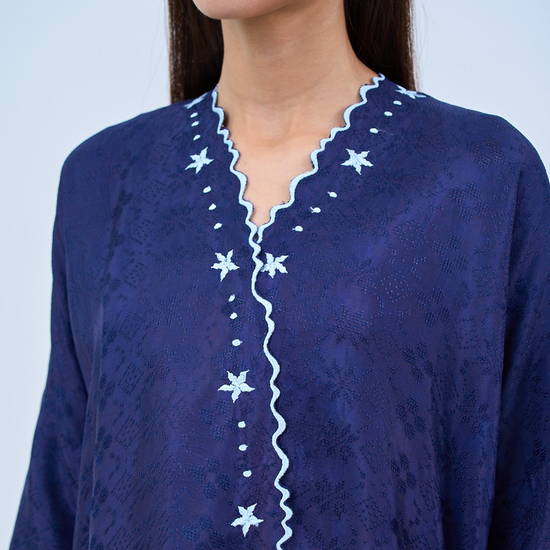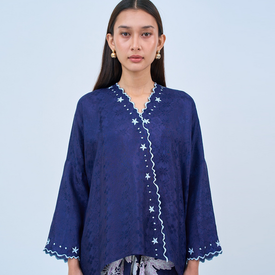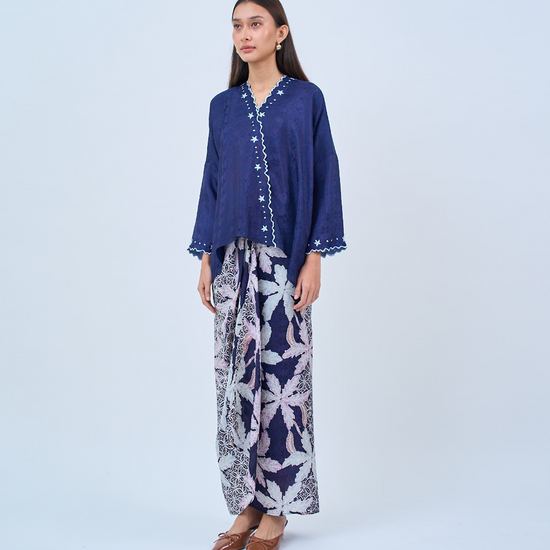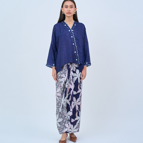 MALIKA blends kurung and kimono influences with a drop-shoulder top and front snap button. Designed using THEA’s in-house semi-silk batik print, it blends heritage charm with a soft flair.