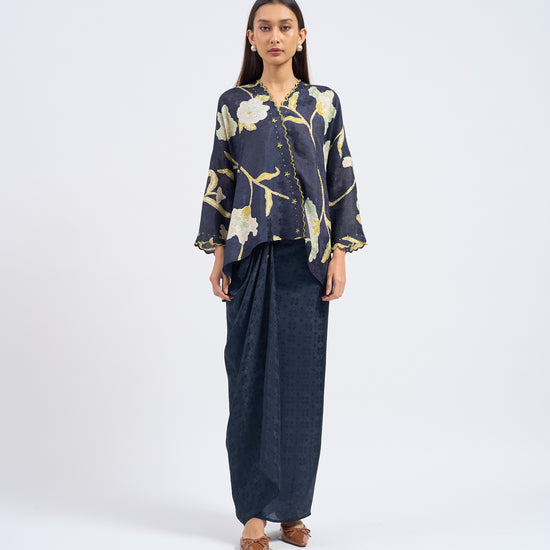 MALIKA blends kurung and kimono influences with a drop-shoulder top and front snap button. Designed using THEA’s in-house semi-silk batik print, it blends heritage charm with a soft flair.