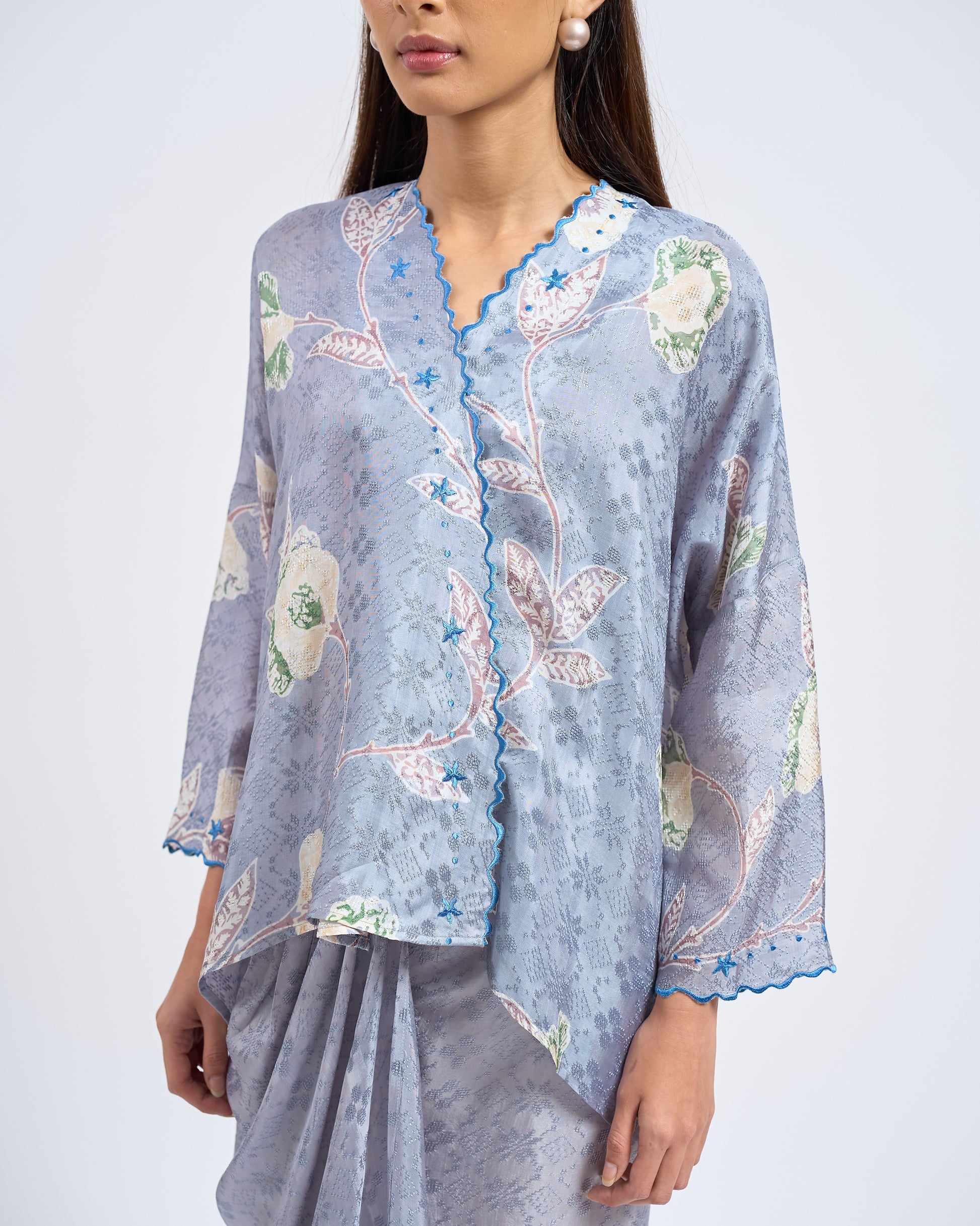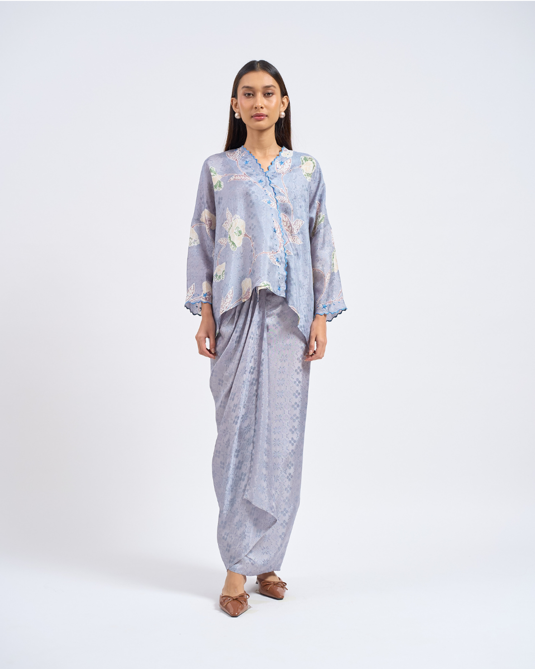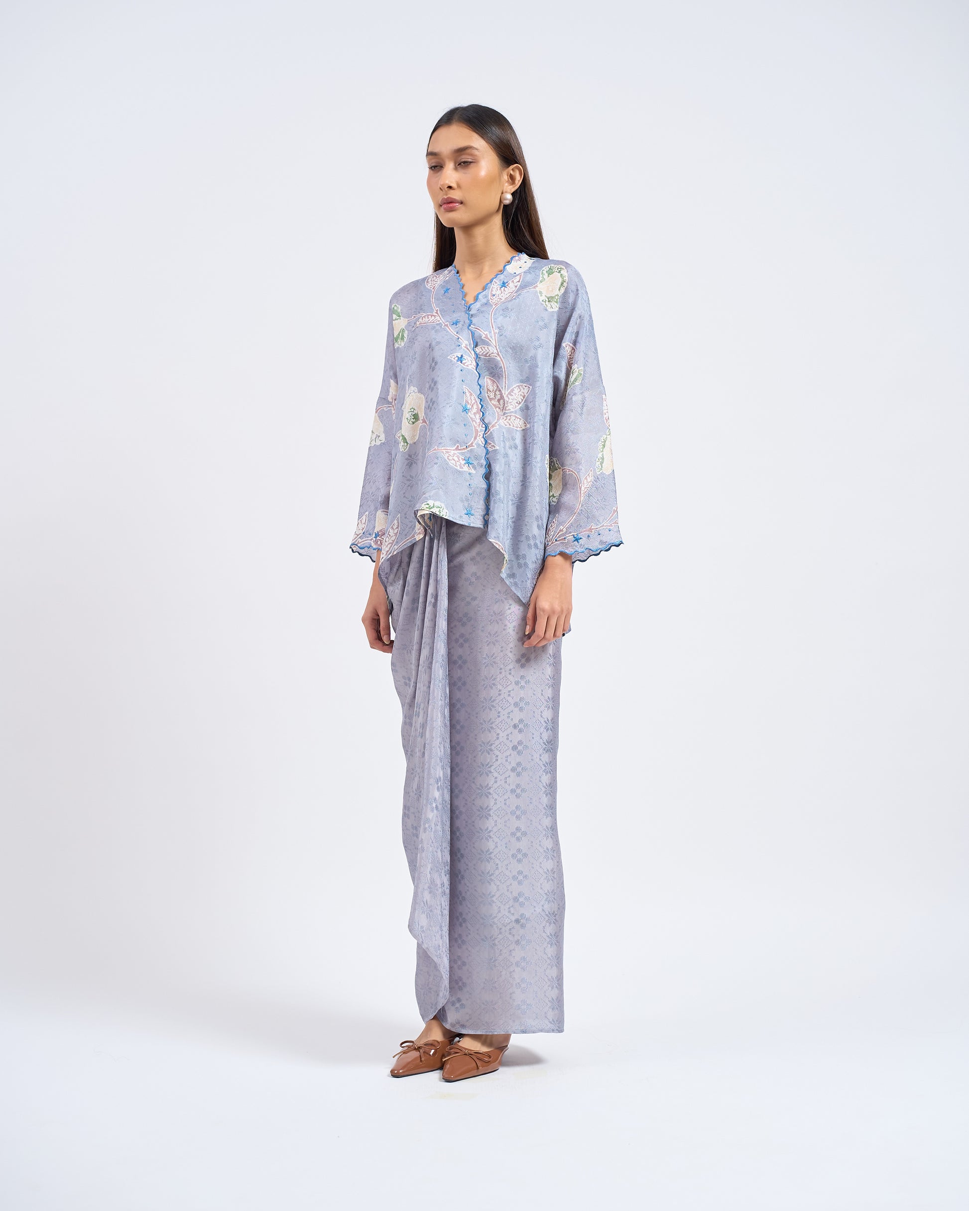MALIKA blends kurung and kimono influences with a drop-shoulder top and front snap button. Designed using THEA’s in-house semi-silk batik print, it blends heritage charm with a soft flair.