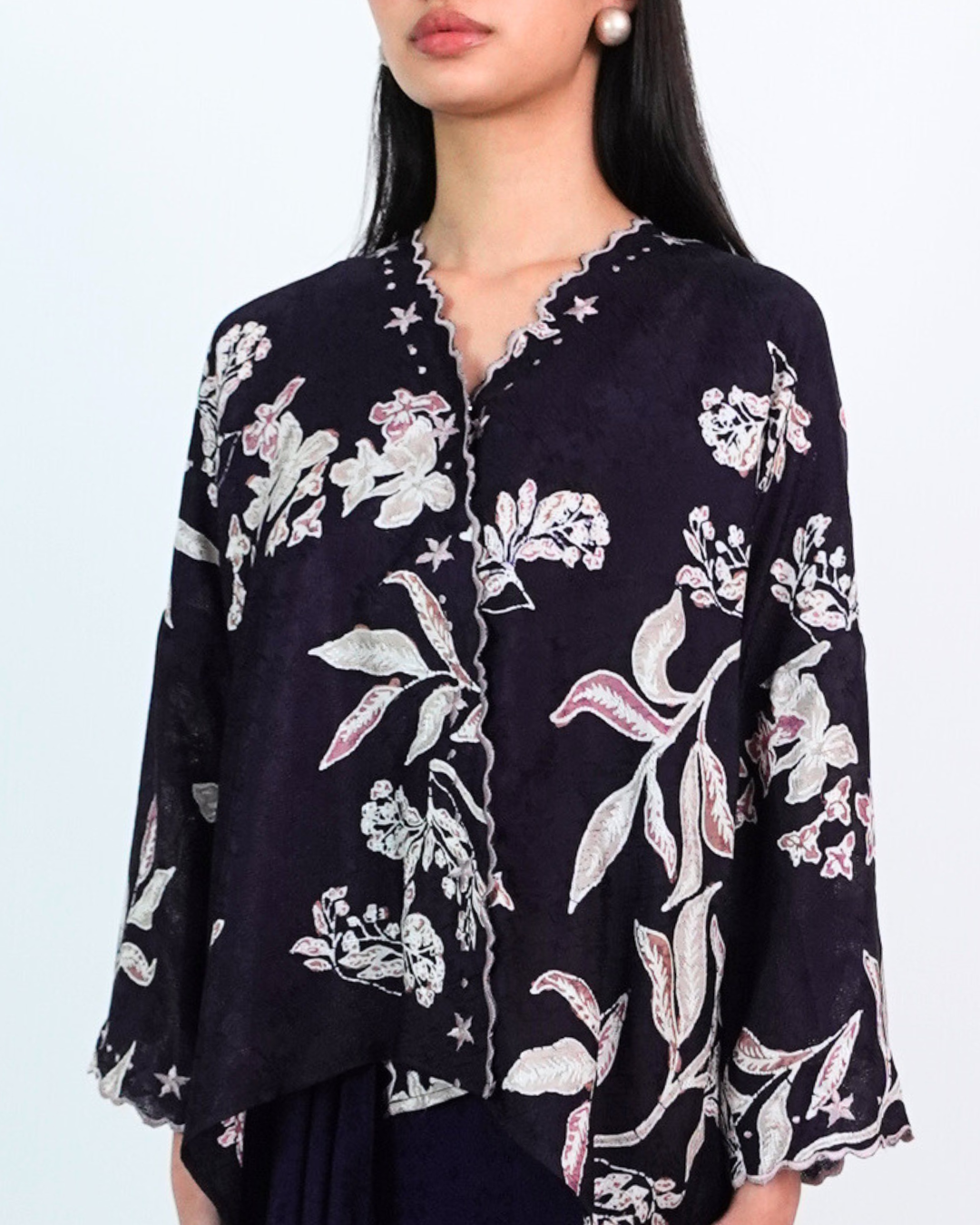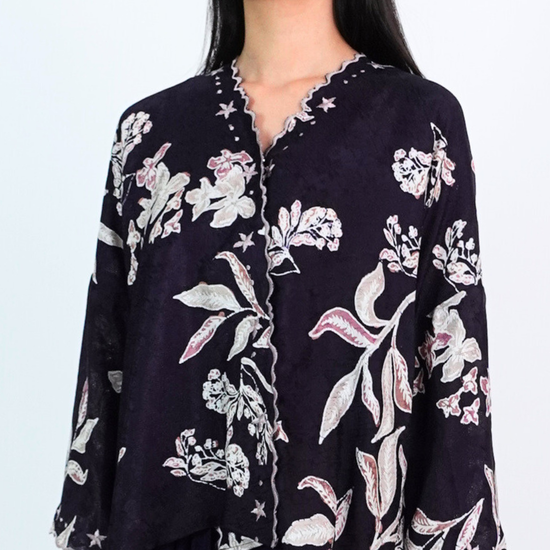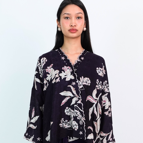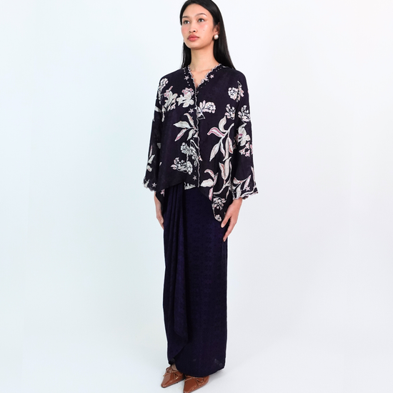 MALIKA blends kurung and kimono influences with a drop-shoulder top and front snap button. Designed using THEA’s in-house semi-silk batik print, it blends heritage charm with a soft flair.