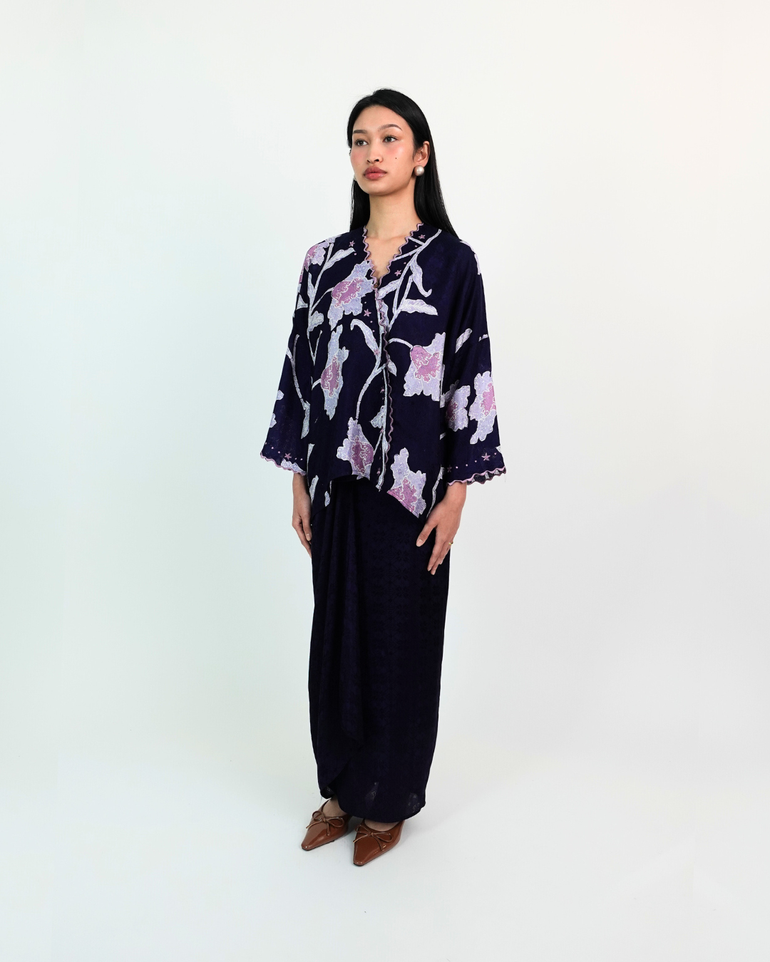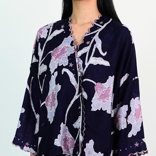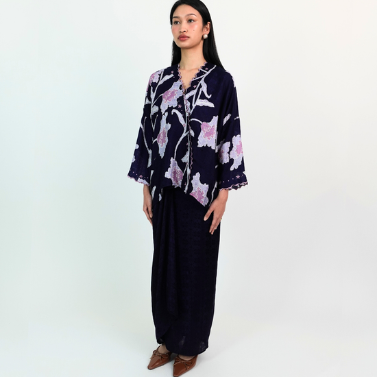 MALIKA blends kurung and kimono influences with a drop-shoulder top and front snap button. Designed using THEA’s in-house semi-silk batik print, it blends heritage charm with a soft flair.