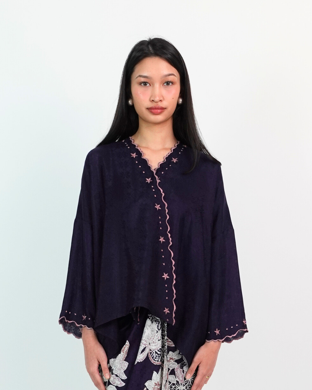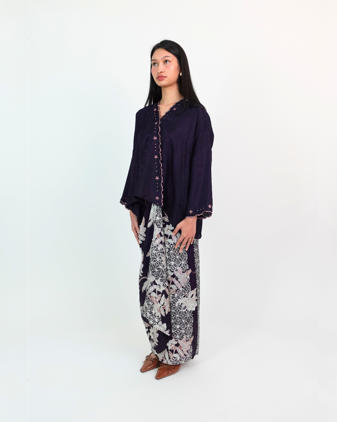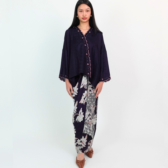 MALIKA blends kurung and kimono influences with a drop-shoulder top and front snap button. Designed using THEA’s in-house semi-silk batik print, it blends heritage charm with a soft flair.