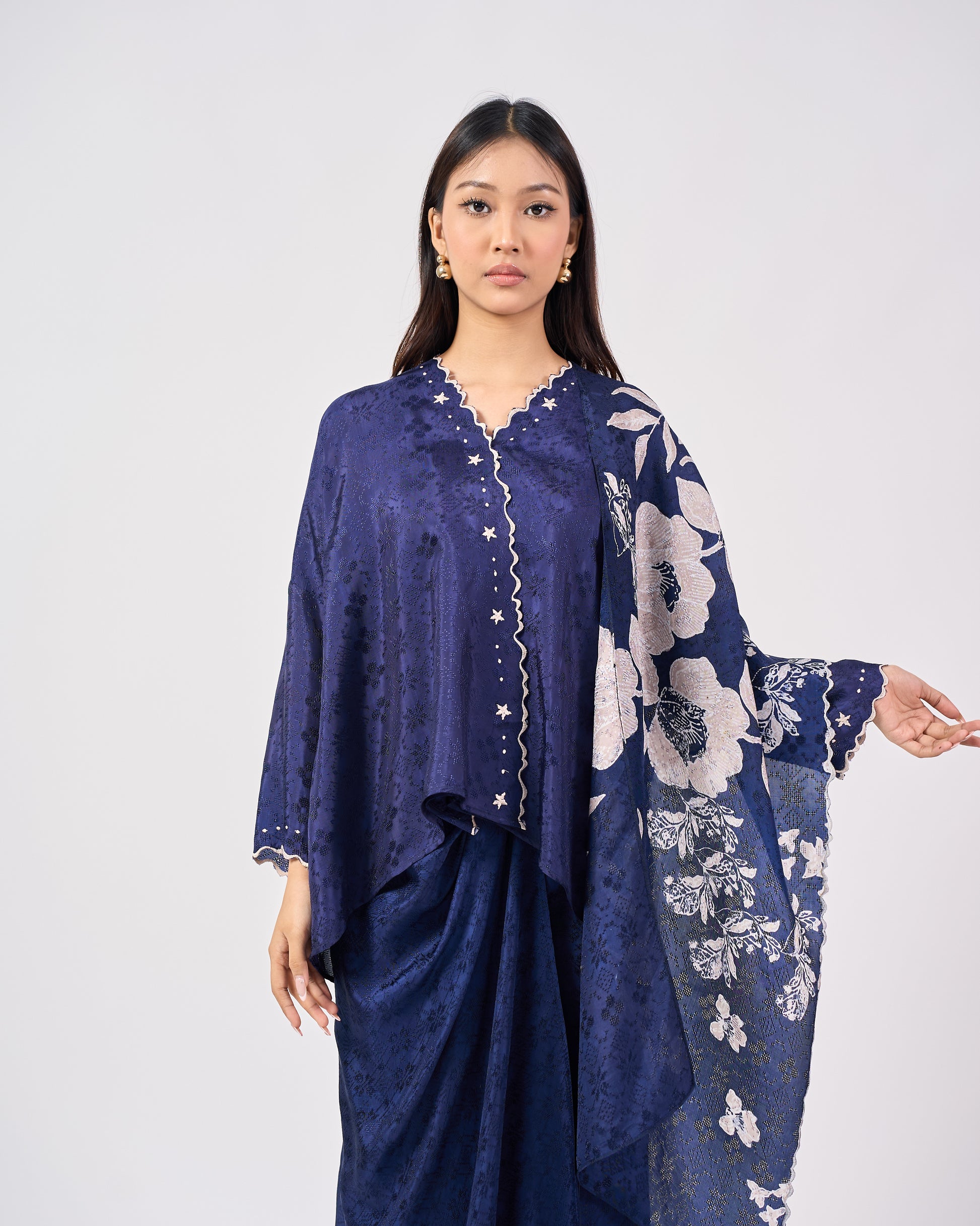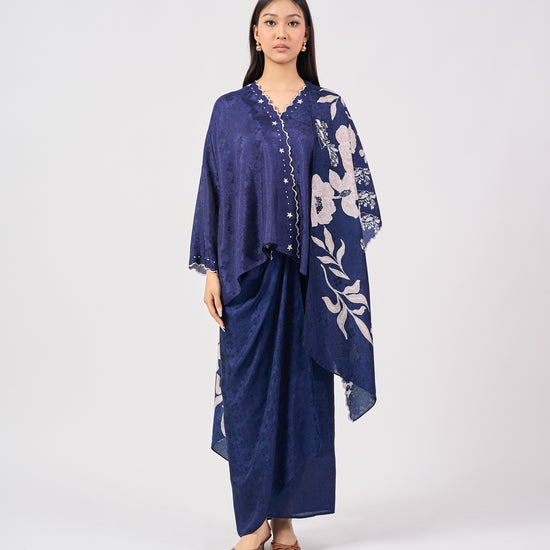MALIKA blends kurung and kimono influences with a drop-shoulder top and front snap button. Designed using THEA’s in-house semi-silk batik print, it blends heritage charm with a soft flair.
