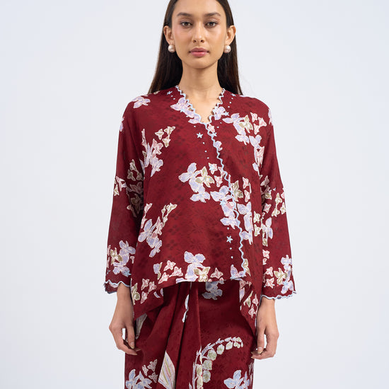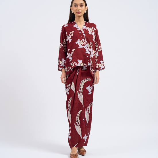 MALIKA blends kurung and kimono influences with a drop-shoulder top and front snap button. Designed using THEA’s in-house semi-silk batik print, it blends heritage charm with a soft flair.