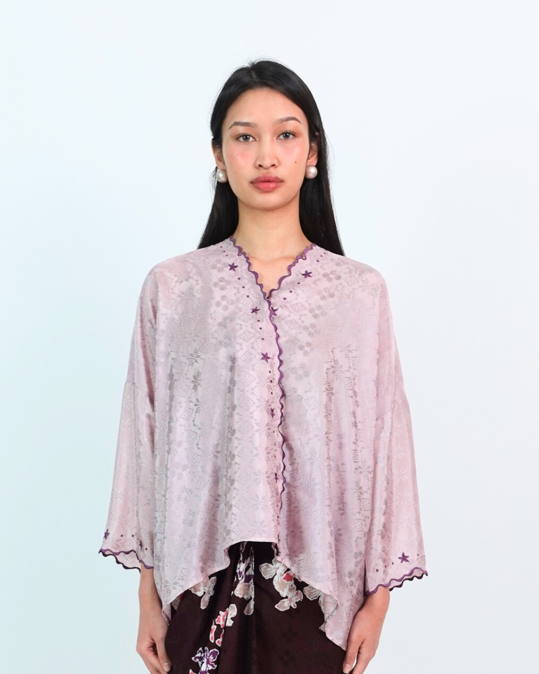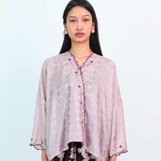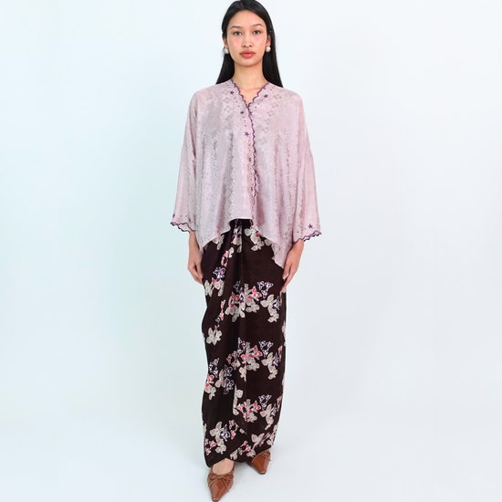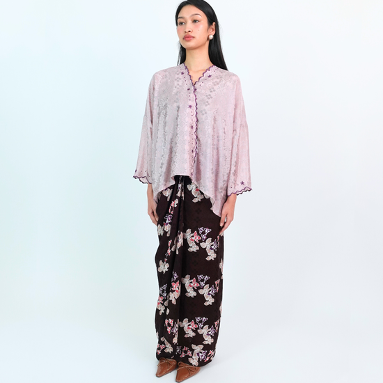 MALIKA blends kurung and kimono influences with a drop-shoulder top and front snap button. Designed using THEA’s in-house semi-silk batik print, it blends heritage charm with a soft flair.