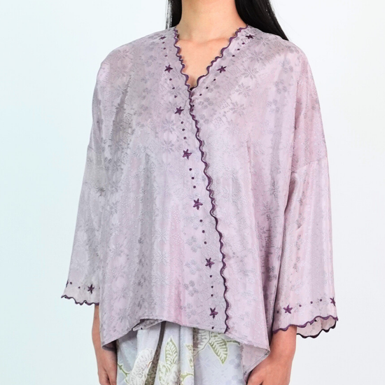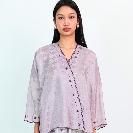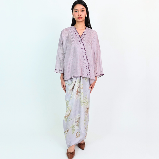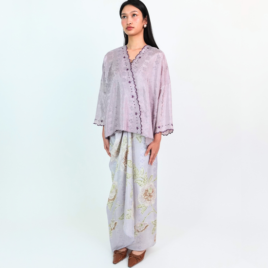 MALIKA blends kurung and kimono influences with a drop-shoulder top and front snap button. Designed using THEA’s in-house semi-silk batik print, it blends heritage charm with a soft flair.