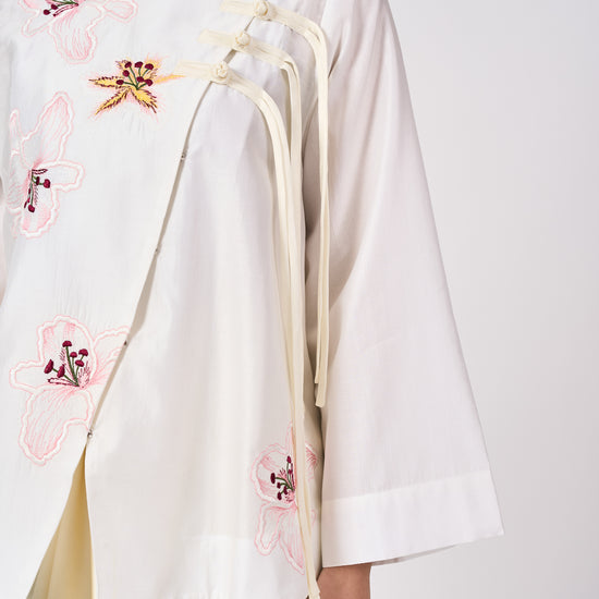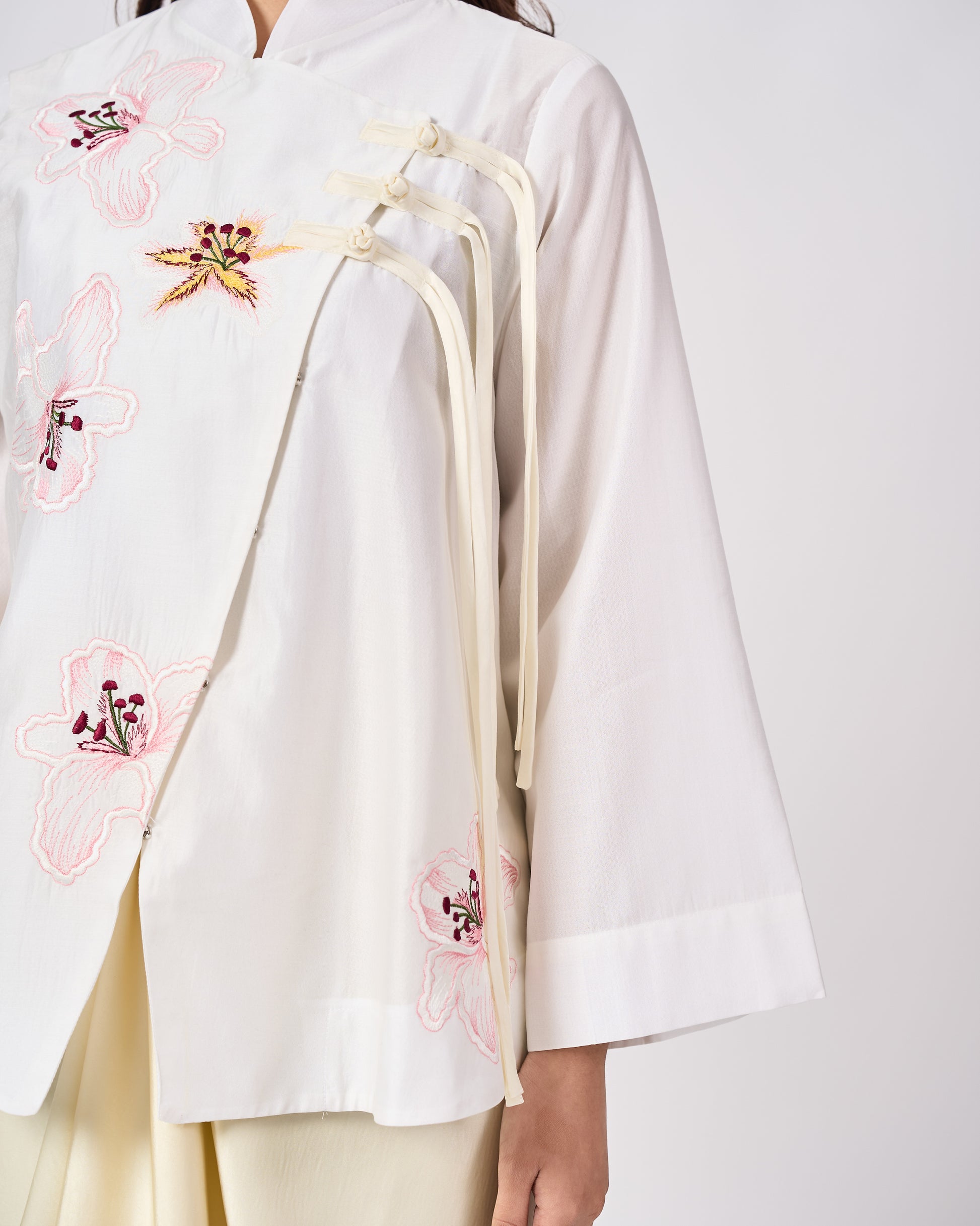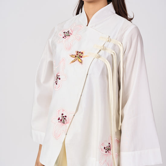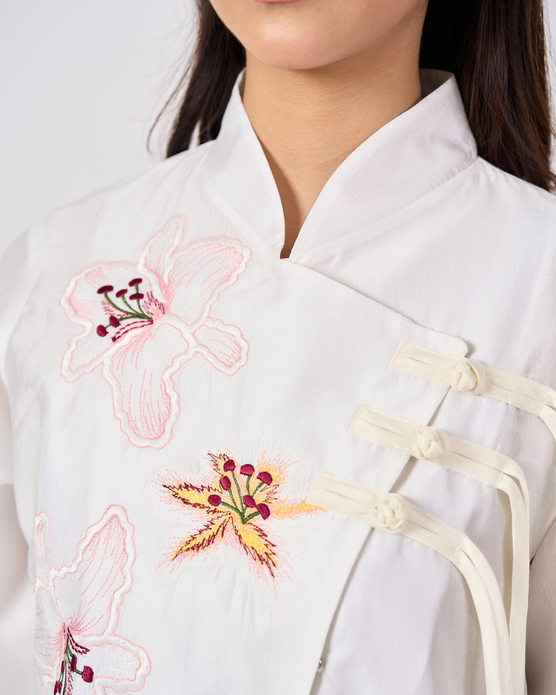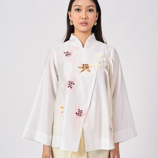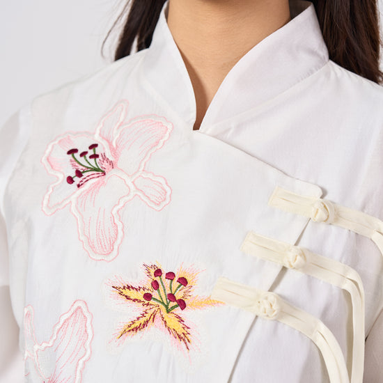 The Mariam top is inspired by the elegance of traditional Cheongsam silhouettes, reinterpreted with a modern twist. Featuring delicate Shanghai knot buttons and soft floral embroidery, it blends classic Chinese charm with contemporary ease. Perfect for refined, effortless dressing.