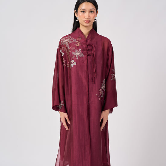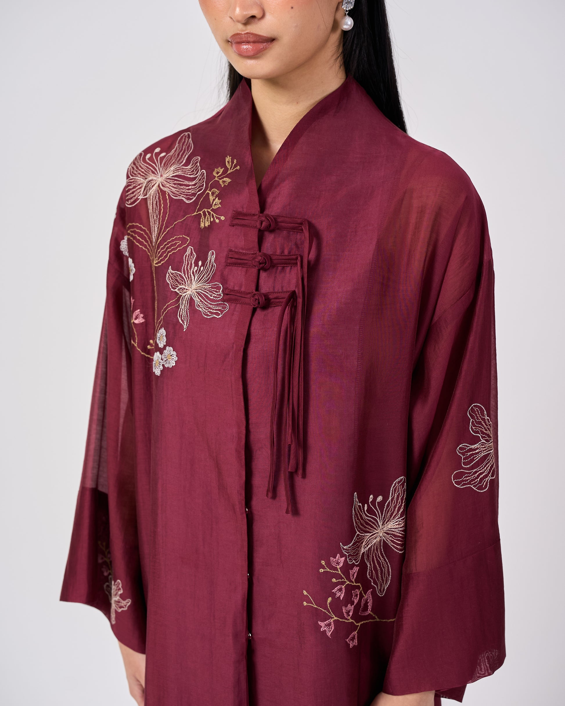 The Nara Kebaya Panjang is a refined reinterpretation of a classic silhouette. The longline top features a sleek mandarin collar with delicate front embroidery that adds soft texture without overwhelming the silhouette