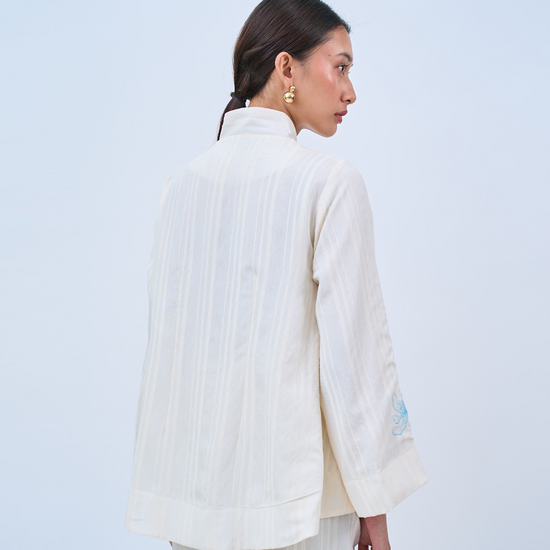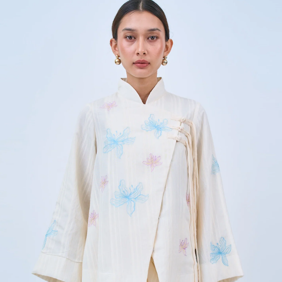 The REIA Top is a relaxed, modern take on the cheongsam silhouette, made from soft cotton for all-day comfort. The delicate embroidery and Shanghai knot buttons with front panel flaps brings out the soft chair for an effortless dressing