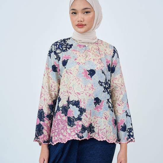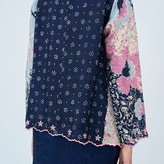 SARINA is a short kurung inspired by the classic Kedah silhouette, elevated with embroidered slit sleeves and full semi-silk batik detailing.